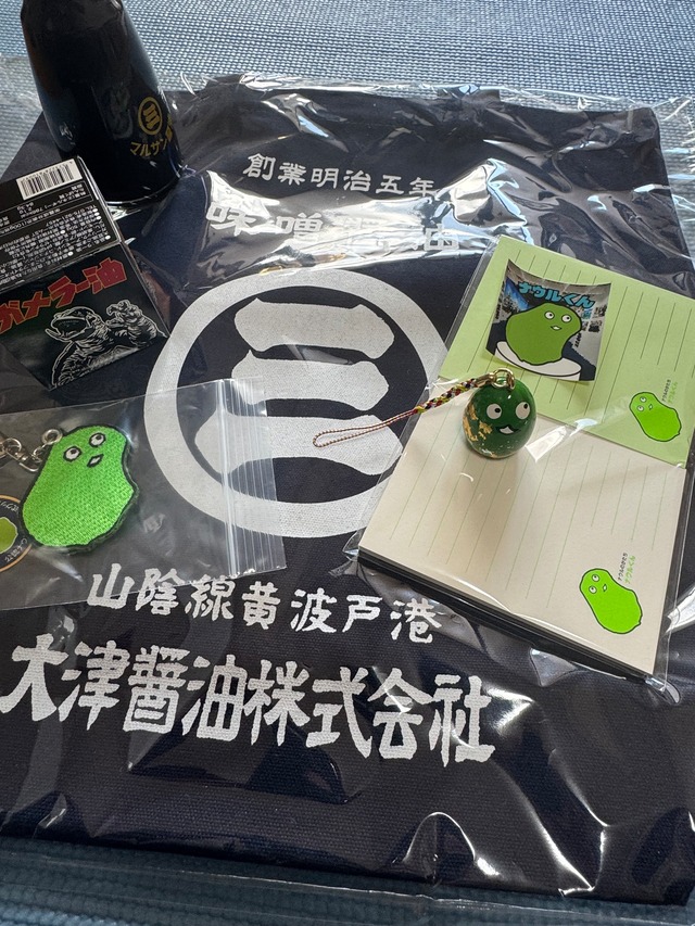 はぐれ大内塗りナウルくん(3センチ)準公式 片面ナウルくん刺繍キーホルダー(5センチ)準公式 大津醤油トートバッグ 大津おさしみマルサン醤油 カレー工房ギャー様 ガメラー油 提供頂いたおまけ ナウルくんメモ(2冊セット) ナウルくんシール