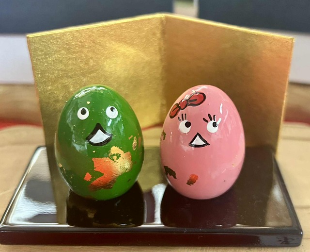 セット内容 サイズはキーホルダーと同じですが頭に穴が空いてません ・大内塗りナウルくん(3センチ)桜の木、金箔 ・大内塗りナウルちゃん(3センチ)桜の木、金箔 ・大内塗りの技術を活用した黒台座 ・厚紙金屏風 ・箱