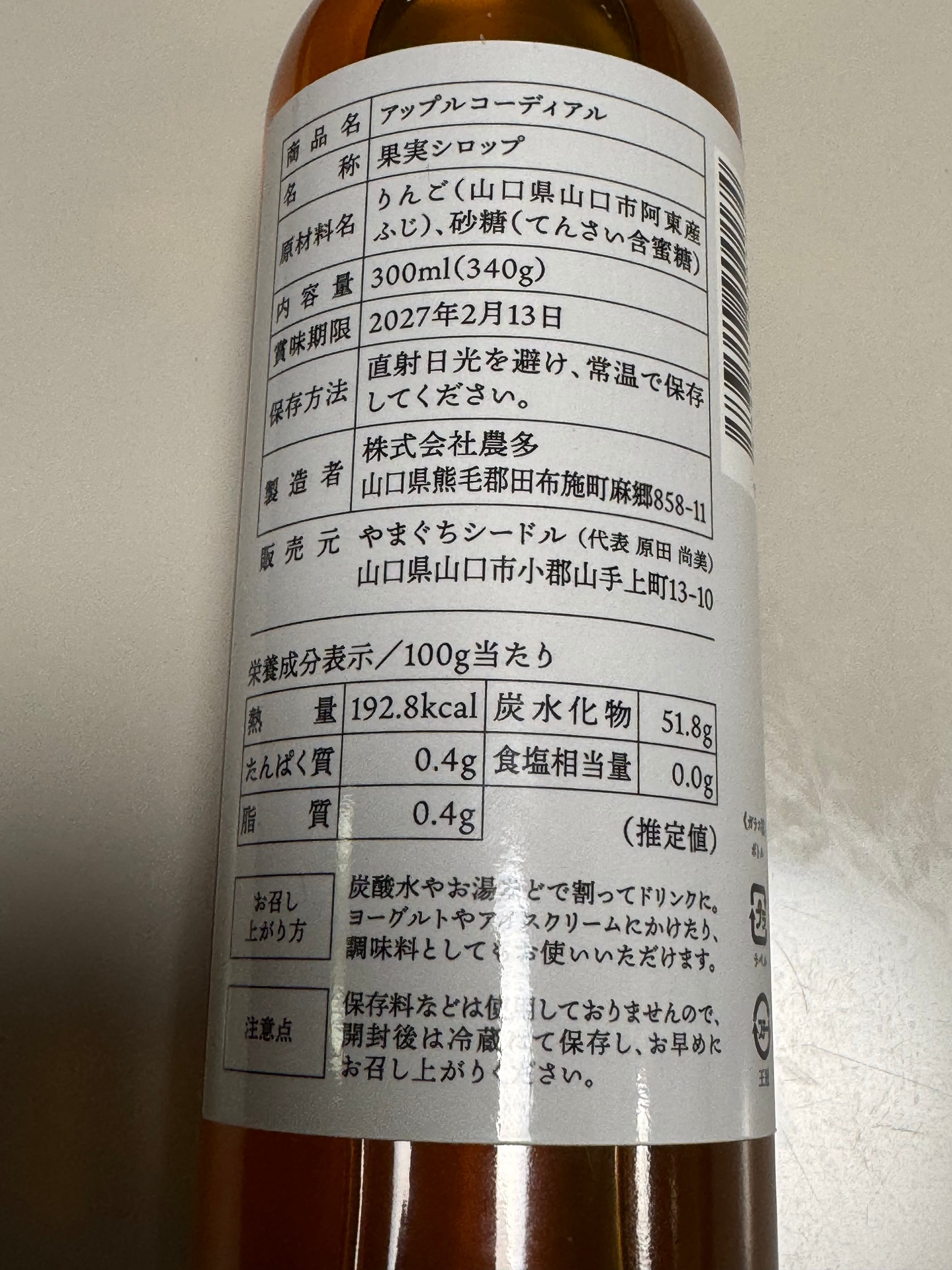 やまぐちシードルさんの山口県山口市阿東産のりんご「ふじ」を使った果実シロップ。